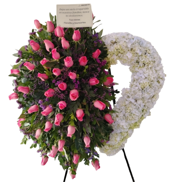 Hermosa corona tipo corazón en parante de fierro con pompos u hortensias, rosas rosadas, eucalipto, mirto y finos follajes.