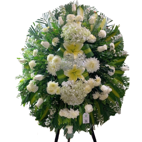 Corona fúnebre blanca, con hortensias blancas, rosas blancas, hojas de dracenia, monte casino, hojas de palmera y hojas de eucalipto