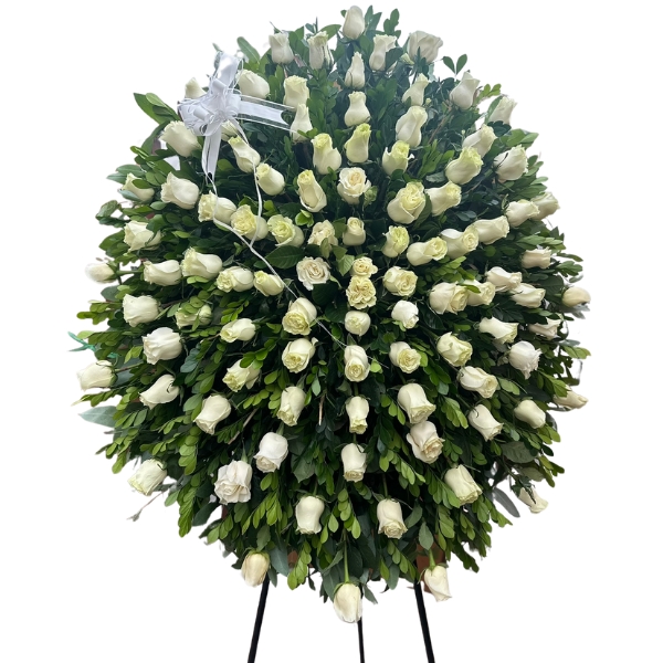 Hermosa y elegante corona con 70 rosas blancas, astromelias , mirto y hermoso lazo.