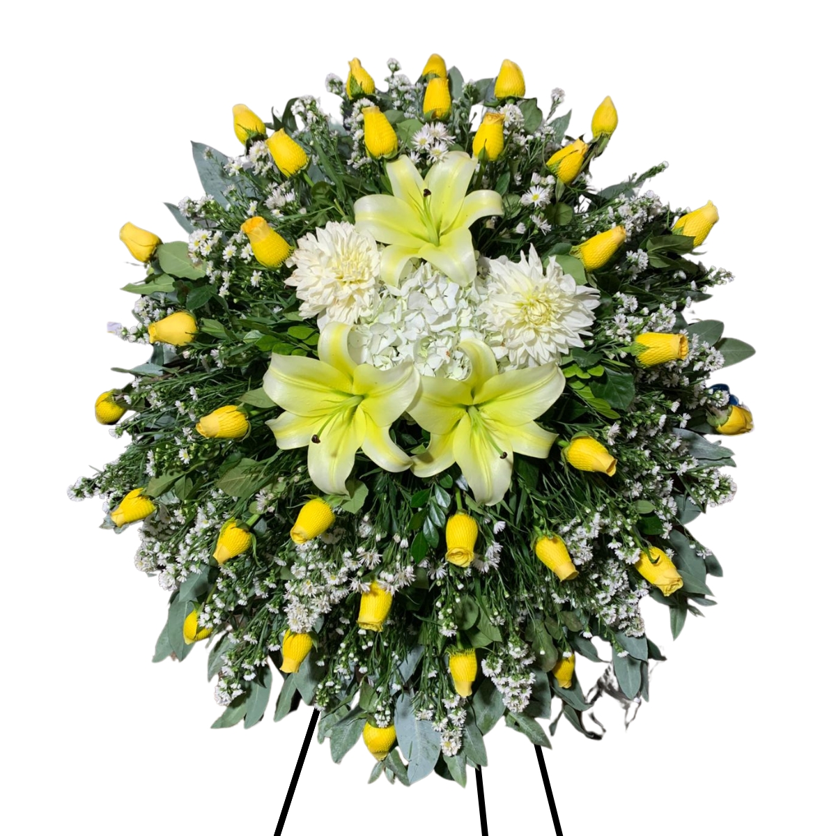 Elegante lágrima en pedestal con rosas amarillas, hortensia, lilium blanco o crema, hojas de eucalipto, montecasino blanco, dalias y mirtos.